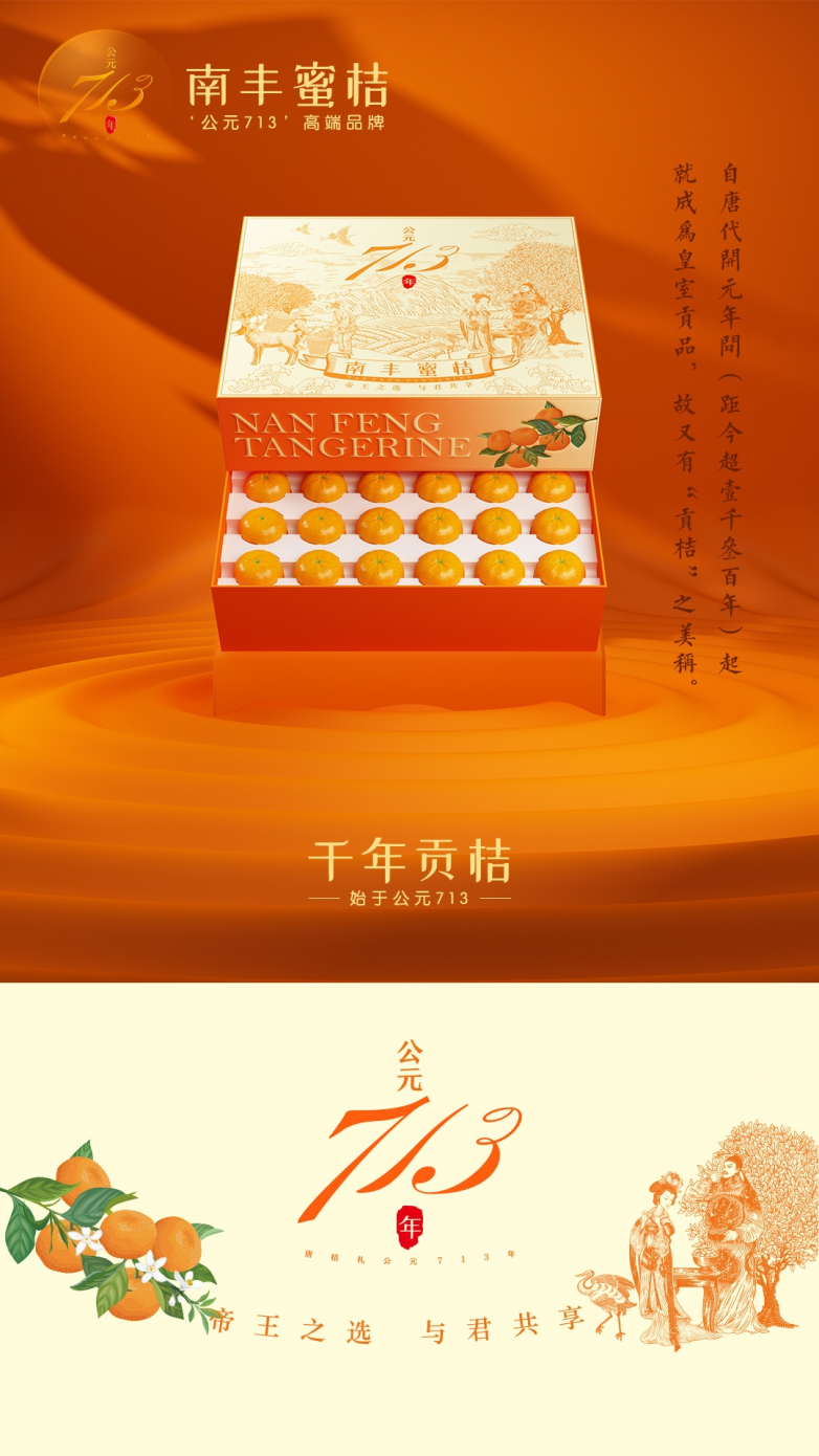 由南丰县蜜桔产业园智慧运营中心开发的“开元”系列高端品牌“公元713”高端鲜果及“唐桔礼”高端文创。“唐桔礼公元713年”源于南丰蜜桔的荣耀起点——公元713年大唐开元盛世。设计团队深入研究了盛唐时期的艺术文献与器物美学,将那个时代的文化气度凝练于方寸礼盒之间。此举不仅是对千年贡品文化的深度挖掘,更旨在通过融合盛唐美学与现代设计语言,为这款历史名果赋予全新的价值表达与消费体验,引领高端农产品的礼赠升级。
