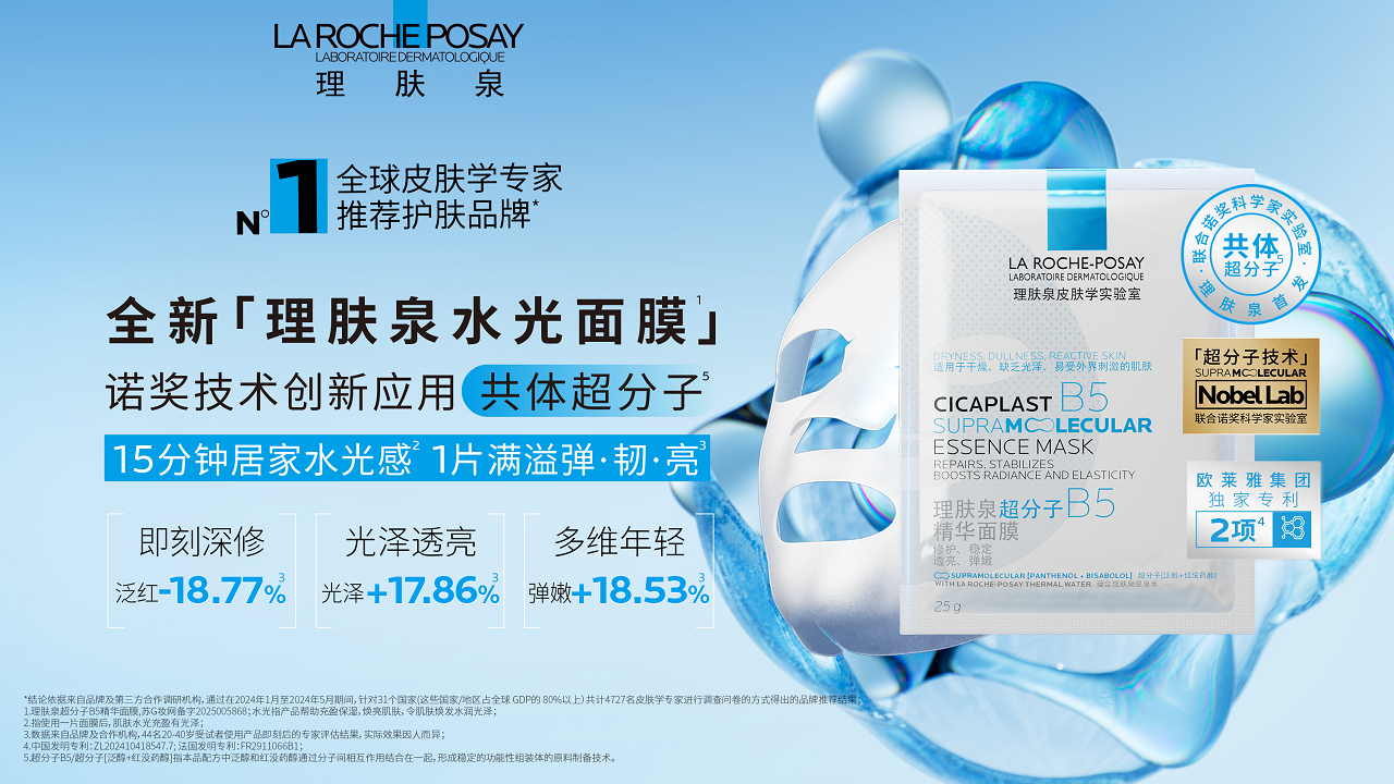 理肤泉水光面膜3正是双方全新合作的首个重点产品。理肤泉水光面膜创新应用曾三次获得诺贝尔化学奖认可的超分子技术,通过超分子化学反应,生成新的分子间“榫卯”结构——共体超分子【B5+红没药醇】成分,突破单一成分功效天花板。产品另复配胶原酵母菌4等皮肤学级成分协同增效。理肤泉水光面膜能密集修护多种问题皮肤,实现15分钟居家水光感5,1片满溢弹嫩亮,达成即刻深修、光泽透亮、多维年轻6。该产品向消费者展现了科学修护的卓效实力,将源自诺奖科学家实验室的超分子技术融入日常护肤,打造出兼具即时水光感与长效修护力的标杆产品。