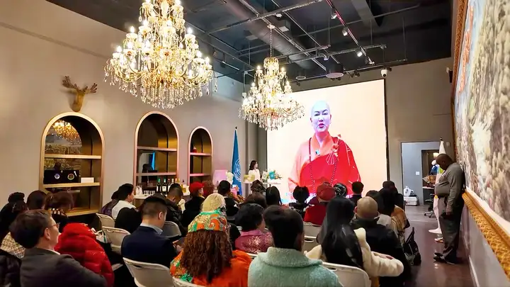 随后,非洲皇太后德洛伊斯·布莱克利女士、世界艺术家协会主席王余根先生、美国东西方艺术文化协会主席李同欣老师、纽约餐饮协会会长Daniel Chen先生先后登台致辞,从不同角度分享了对全球可持续发展的深刻见解与实践经验。活动现场还播放了中国第一比丘尼道场竹林寺明道方丈大和尚的慈悲开示与祝福视频,为本次盛会增添了一份特殊的精神力量。