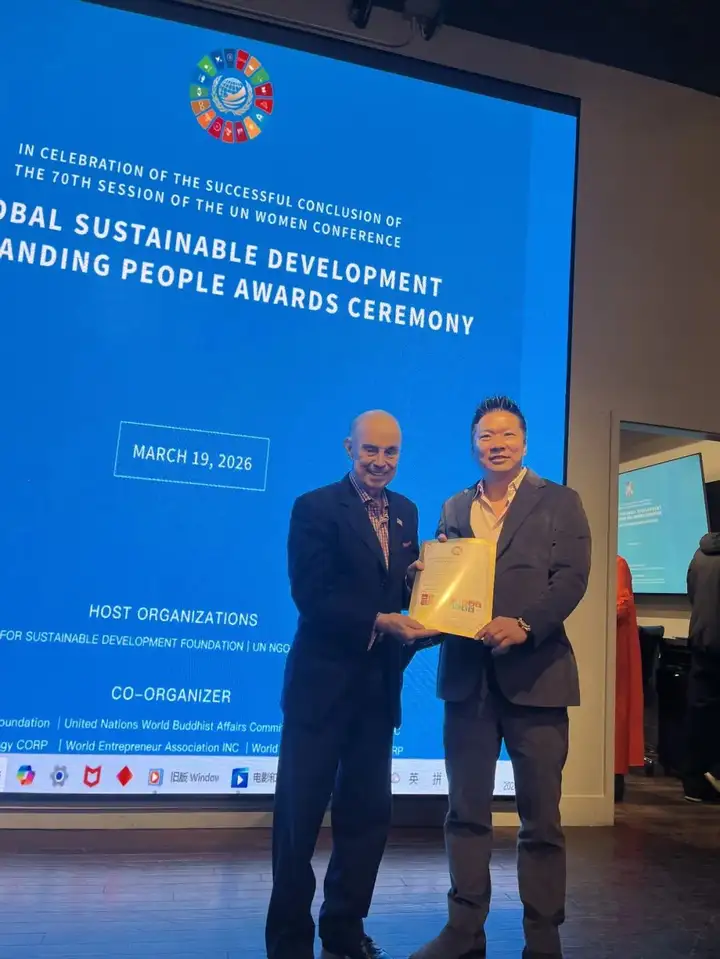 世界艺术家协会主席王余根、美国东西方艺术文化协会主席李同欣、纽约餐饮协会会长Daniel Chen三位行业翘楚,因在推动行业进步、助力全球可持续发展方面的卓越贡献,荣获全球可持续发展杰出人物奖项。他们以专业素养与不懈努力,在各自领域为可持续发展事业贡献了重要力量。