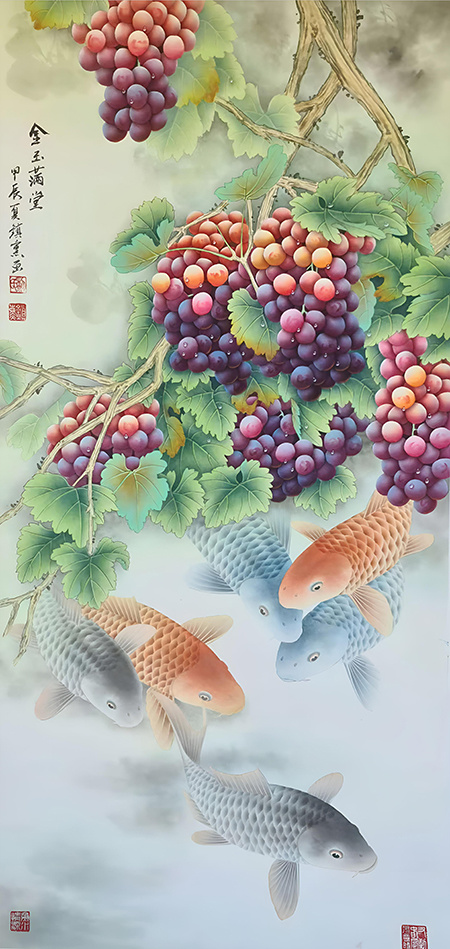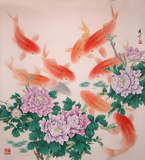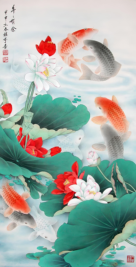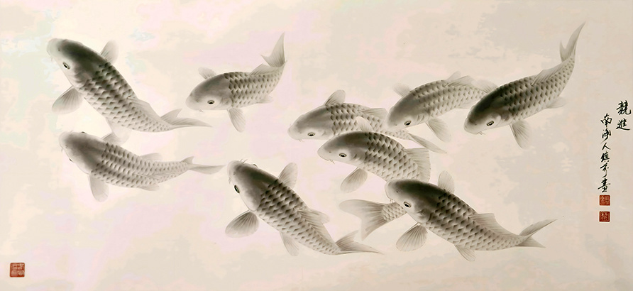 在民族题材的创作中,“鱼水”堪称经典之作。作为当代著名画家,黎镇熏的“鱼水”作品既吸收了中国传统绘画的精髓,又融入了现代艺术的创新理念,展现出独特的艺术风格和高超的绘画技艺。重要的是,他以自然意象为媒介、工笔技法为支撑,挖掘“鱼水”形象的人文内涵,既展工笔画魅力,又为观察鱼的精神世界提供了典型。在他的笔下,用笔、用线、用色、构图、立意,皆考究自然,笔下鱼,皆生机勃勃,灵动惬意,呈现鲜活、自在的生命状态。更难能可贵的是,黎镇熏能够通过鱼的姿态和水的透视、墨色的浓淡,传达出超越物象本身的情感与境界。那些或独游或群戏的鲤鱼,仿佛被赋予了人格化的情感,或恬淡自适,或欢快昂扬,或蓄势待发,让观赏者能感受到画家对自然,对生活,对生命的热爱之情。这种将生命体验融入艺术表达的能力,赋予作品新的内涵和表现方式。